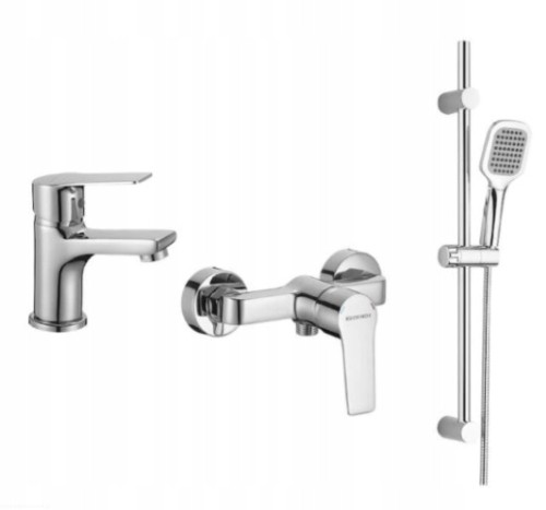 W zestawie: bateria natryskowa, bateria umywalkowa oraz zestaw natryskowy na drążku.