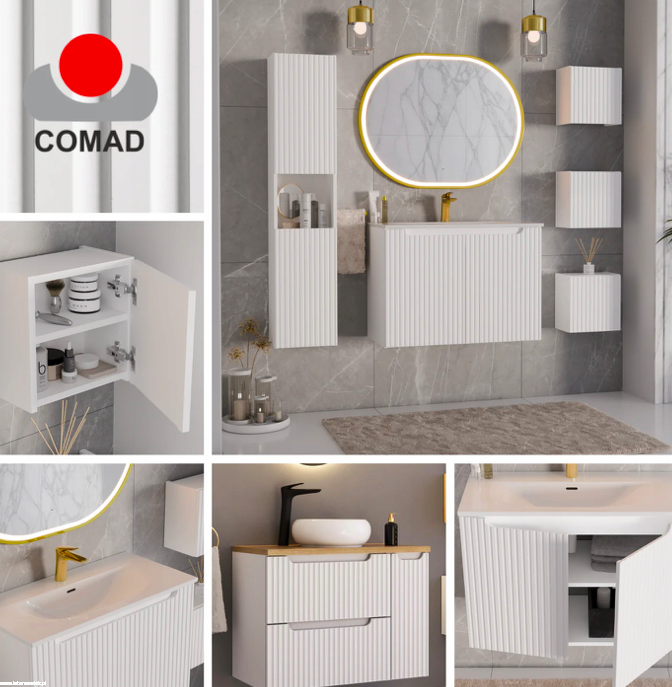 Meble z kolekcji NOVA charakteryzuje mniejsza głębokość, co sprawia, że doskonale sprawdzają się w mniejszych przestrzeniach. Ta cecha i różnorodność wyboru wśród dedykowanych umywalek i dodatków, podkreśla ich wszechstronność, umożliwiając cieszenie się elegancją i funkcjonalnością nawet w ograniczonych miejscach.