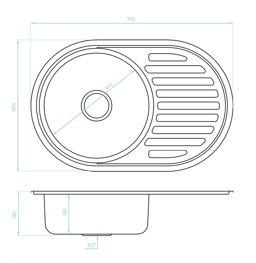 Zlewozmywak stalowy wpuszczany, 1-komorowy, z ociekaczem, w zestawie z syfonem.