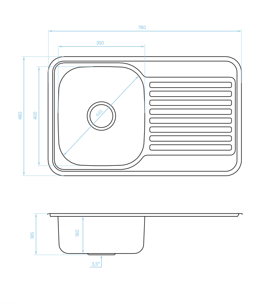 - Odpływ: 3,5 cala