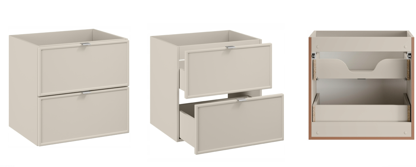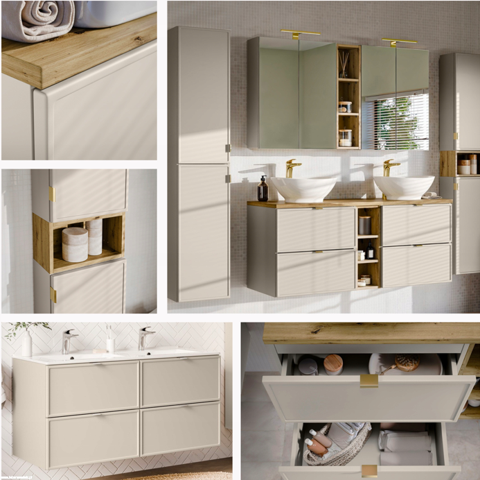 Meble łazienkowe Bella Cashmere to doskonały wybór dla każdej łazienki, charakteryzujący się subtelnym, kaszmirowym kolorem oraz frontami z delikatnym frezowaniem, które tworzą stylową ramkę. Jej uniwersalny design sprawia, że doskonale harmonizuje zarówno z nowoczesnymi, jak i klasycznymi aranżacjami, wprowadzając do przestrzeni niepowtarzalny klimat.