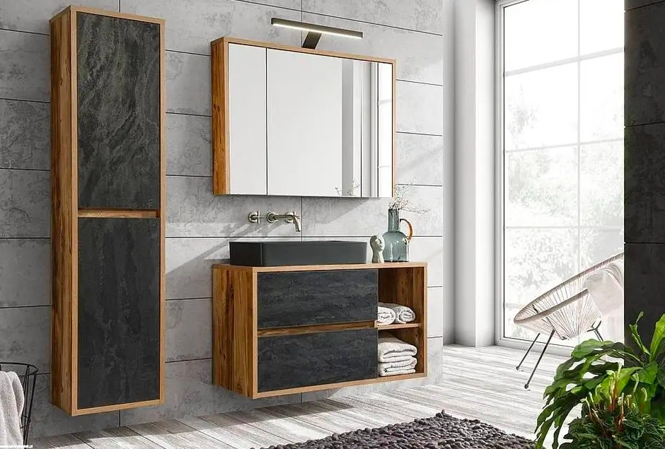 Wszystkie drzwi oraz szuflady posiadają system cichego domyku. Zestaw składa się z szafki pod umywalkę, szafki z lustrem oraz wysokiej szafki. Dodatkową opcją jest możliwość dołożenia do zestawu lampy LED i stylowej umywalki nablatowej.