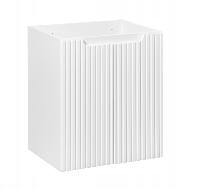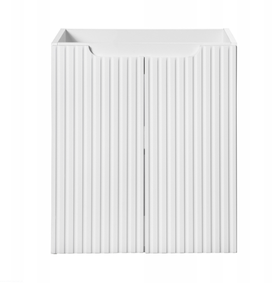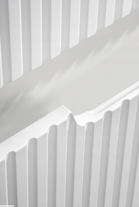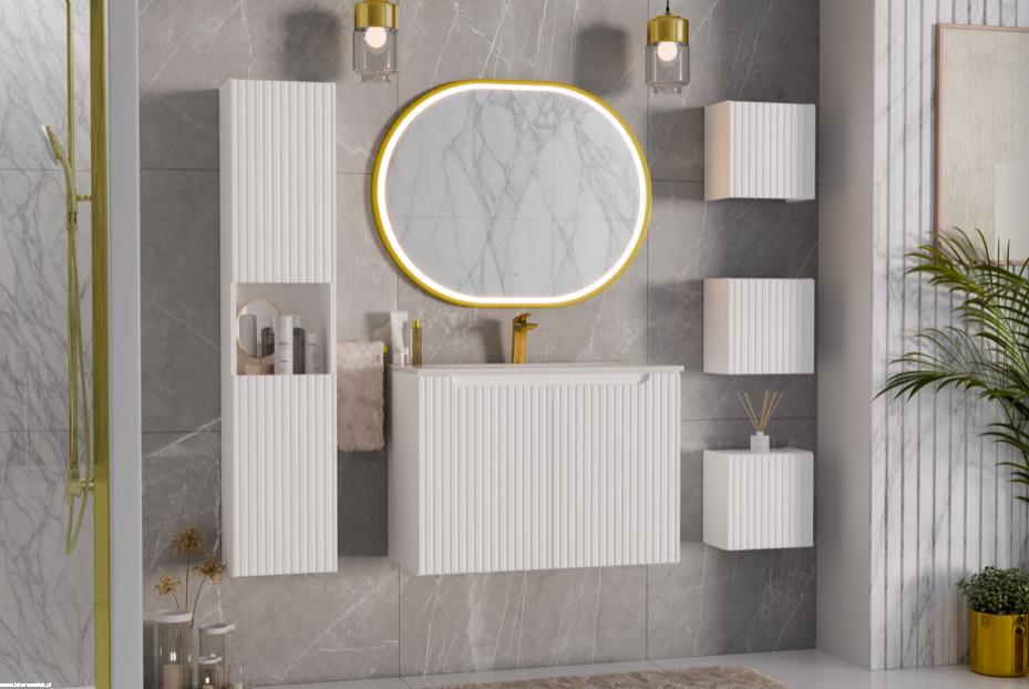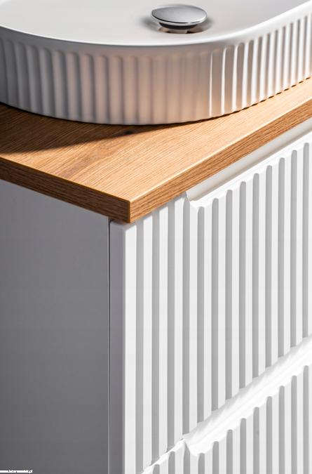 Fronty mebli zdobią pionowe ryflowania, dodając kolekcji miękkiej głębi i unikalnego charakteru.