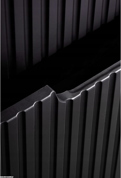 Fronty mebli zdobią pionowe ryflowania, dodając kolekcji miękkiej głębi i unikalnego charakteru.