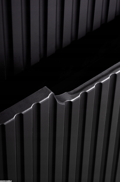 Fronty mebli zdobią pionowe ryflowania, dodając kolekcji miękkiej głębi i unikalnego charakteru.