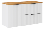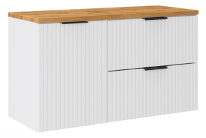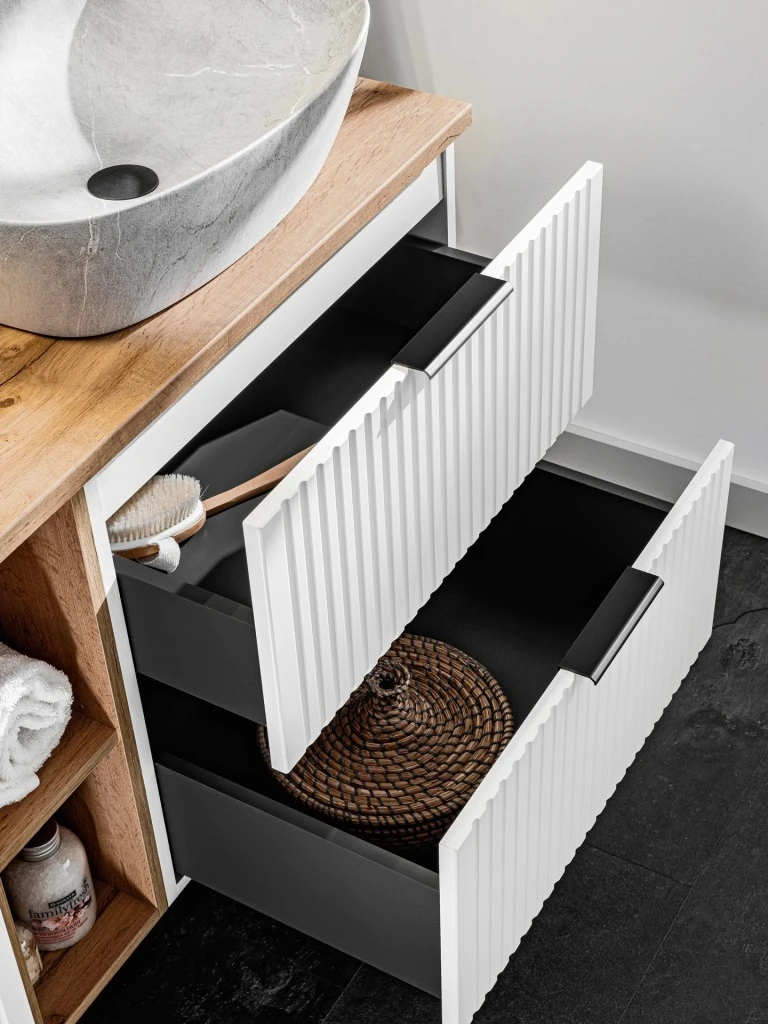 Zestaw meblowy łazienkowy SET-ADW B WOTAN 100 cm to funkcjonalne i nowoczesne rozwiązanie, które łączy elegancki biały mat z ciepłym dekorem dąb Wotan. Stylowe fronty z pionowymi ryflami oraz możliwość wyboru koloru uchwytów (złoty połysk, chrom lub czarny mat) pozwalają dopasować zestaw do różnych aranżacji łazienki. W skład kompletu wchodzi szafka pod umywalkę 60 cm z dwiema szufladami, blat 100 cm oraz szafka 40 cm z wbudowanym koszem na pranie, co zapewnia wygodną organizację przestrzeni. Szuflady wyposażone są w prowadnice z cichym domykiem i częściowym wysuwem, a całość wykonano z trwałych materiałów – płyty laminowanej oraz MDF. Blat z MDF pokryty folią PVC charakteryzuje się odpornością na wilgoć i estetycznym wykończeniem. Zestaw przeznaczony jest do montażu wiszącego, co ułatwia sprzątanie i optycznie powiększa wnętrze. Meble dostarczane są do samodzielnego montażu, wymagają zastosowania syfonu oszczędzającego miejsce (brak w zestawie) i objęte są 2-letnią gwarancją. To solidny, polski produkt łączący nowoczesny design z praktycznymi rozwiązaniami do codziennego użytkowania.