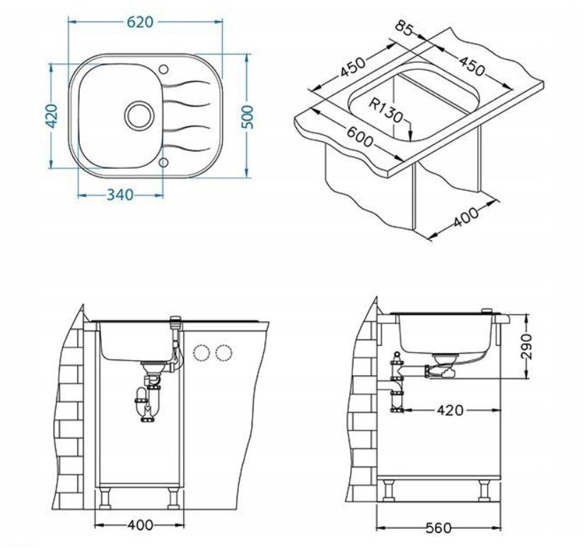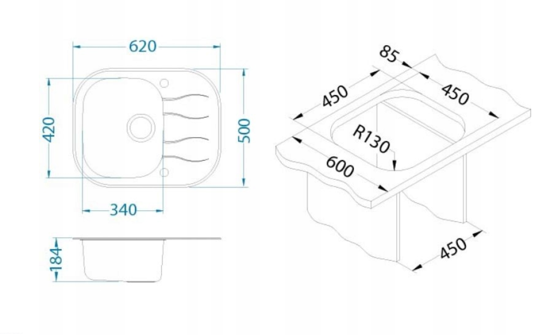Wymiary zlewozmywaka: 620 x 500 mm
