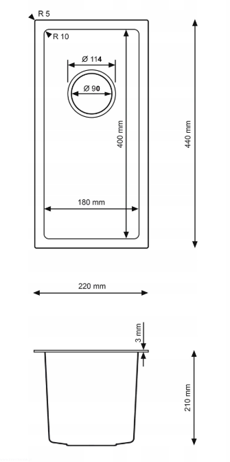 - Wymiary zewnętrzne zlewu: 220 × 440 × 210 mm