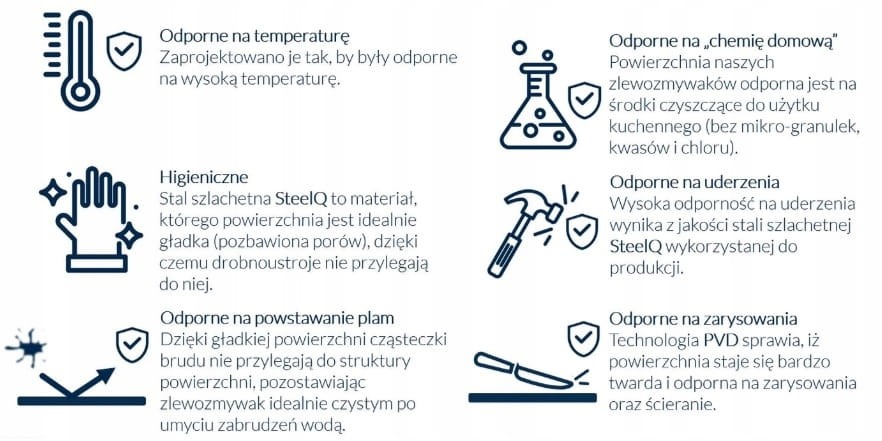 charakteryzuje się wyjątkowymi właściwościami. To materiał, którego powierzchnia jest idealnie gładka, bez porów, dzięki czemu drobnoustroje, bakterie i zanieczyszczenia nie przylegają. Jest higieniczna i łatwa w utrzymaniu czystości. Jednocześnie SteelQ to odporność na wysoką temperaturę (np. gorące garnki) lub tak częste w kuchni nagłe jej zmiany (np. gorąca i zimna woda).