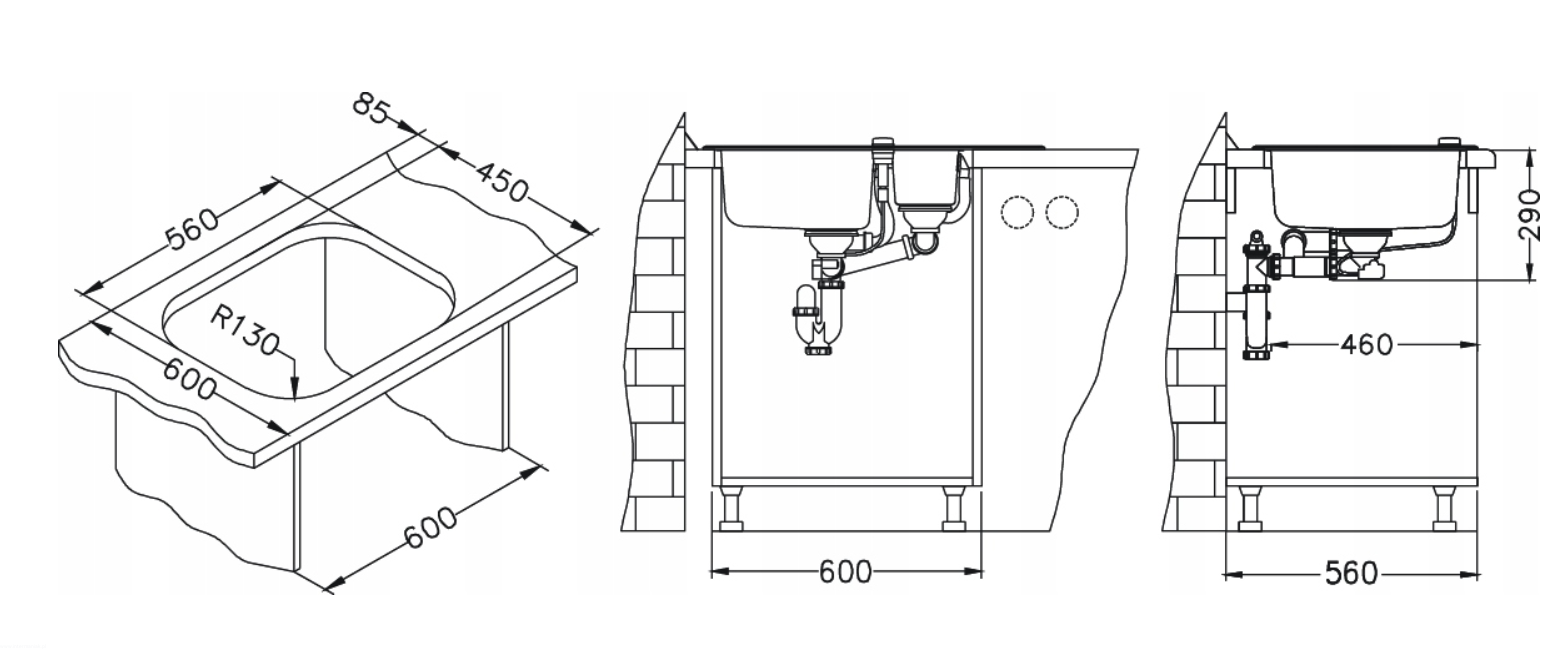 - Wymiary wycięcia w blacie: 560 x 450 mm