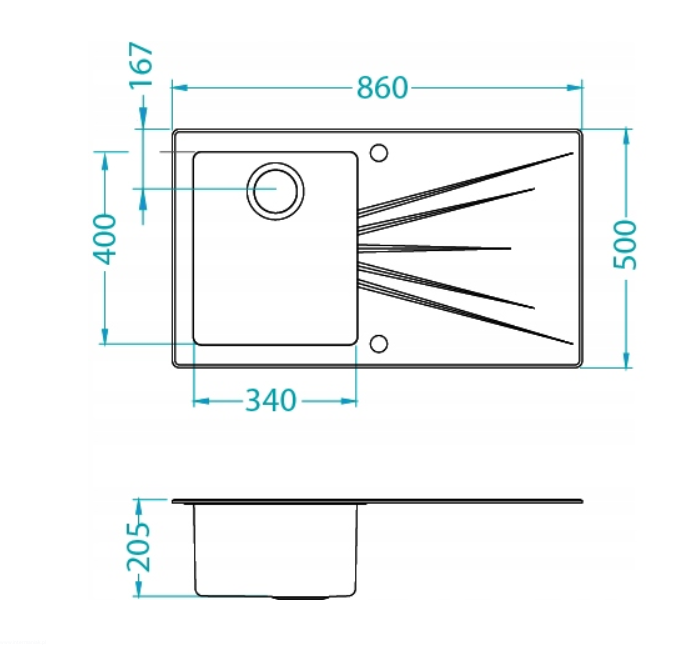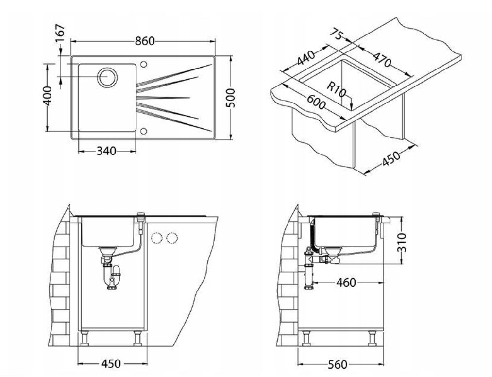 - Wymiary zlewozmywaka: 860 x 500 mm