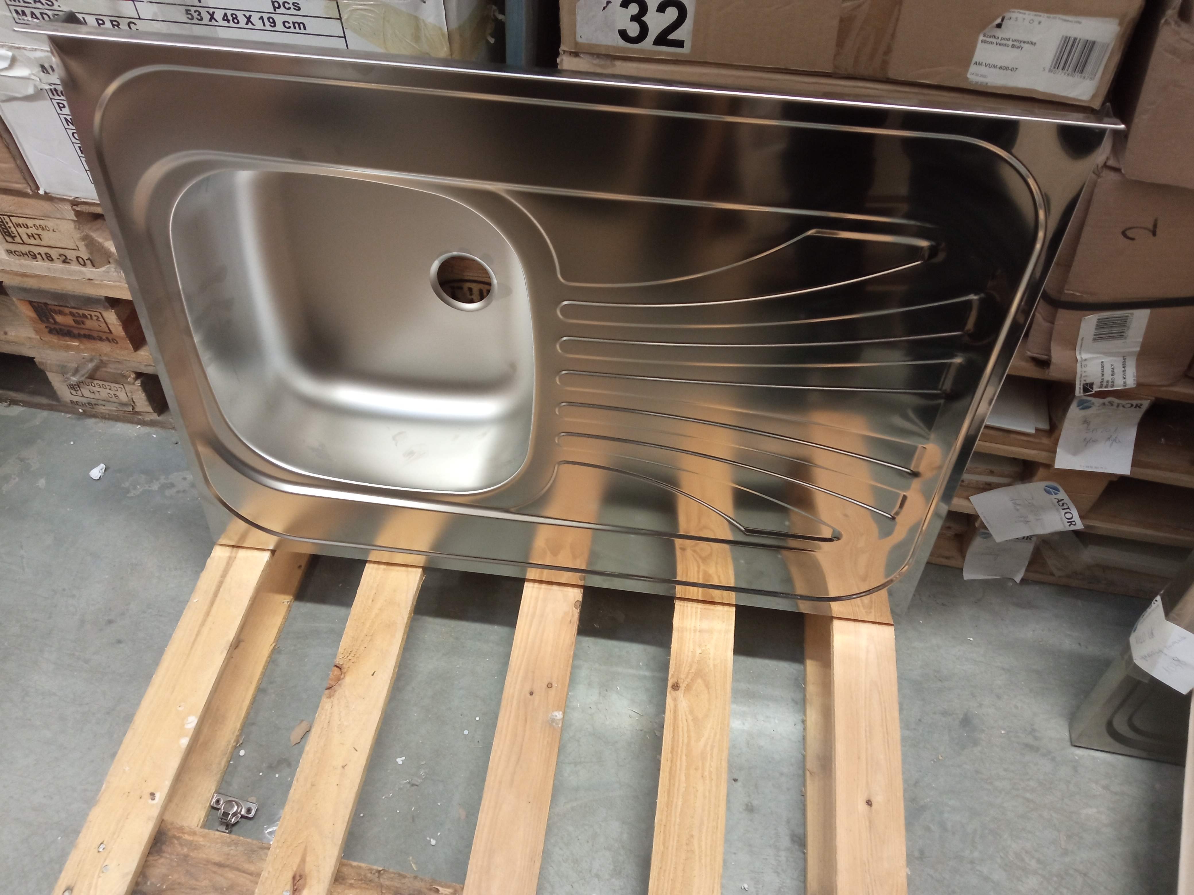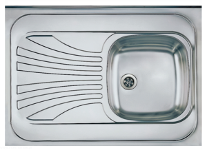 Zlewozmywak stalowy jednokomorowy, nakładany na szafkę z listwą przyścienną i ociekaczem po prawej stronie