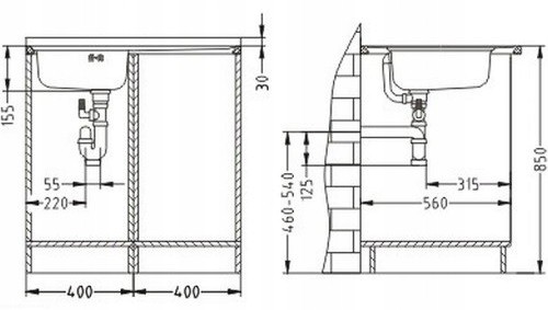 - Wymiary zlewozmywaka: 600 x 800 x 150 mm