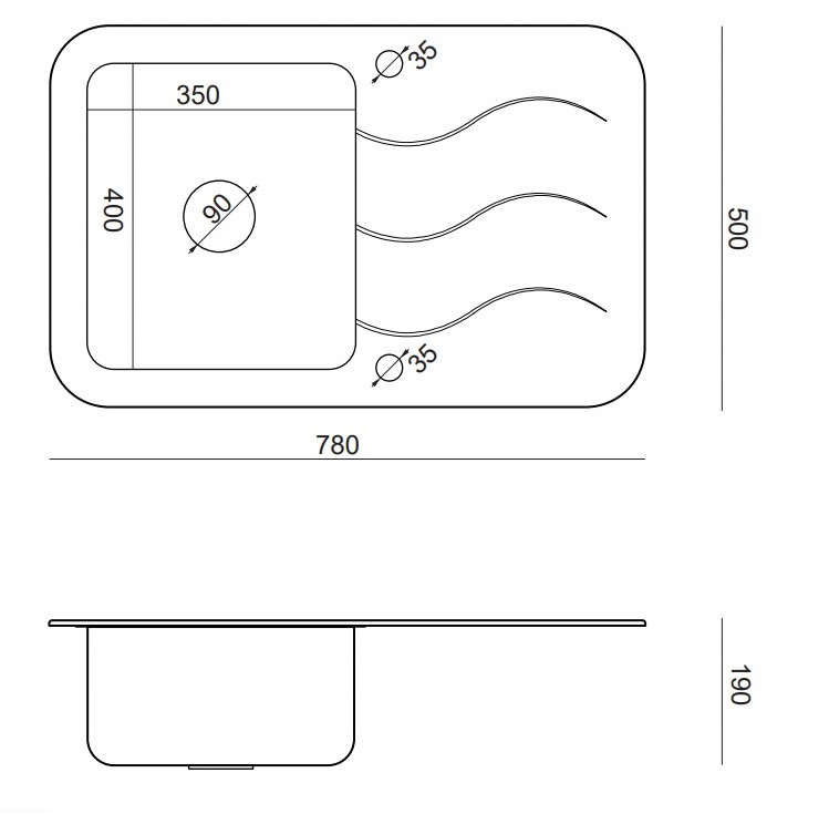 - Wymiar zlewozmywaka: 780 mm x 500 mm
